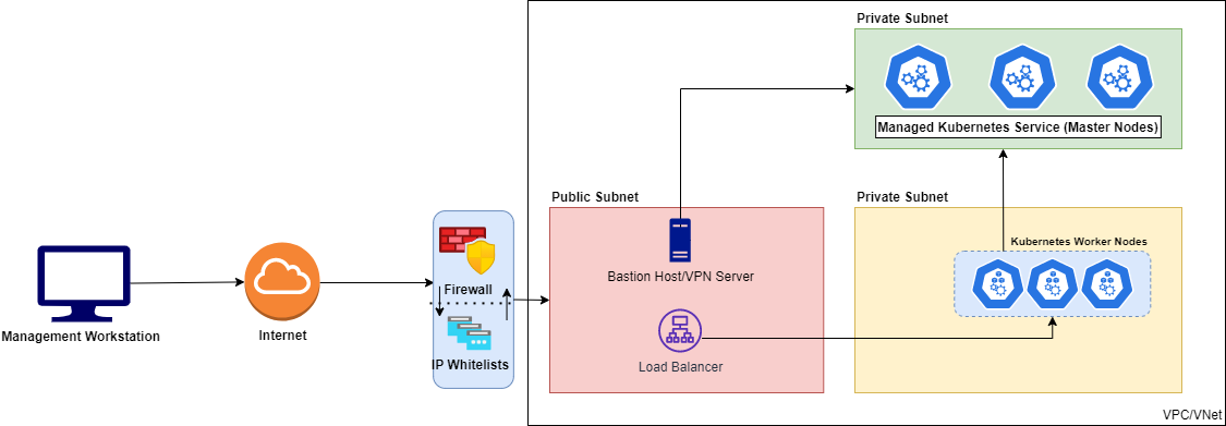 Public subnets used by the bastion host and any resources created by the Kubernetes cluster (for example, Load Balancer)
