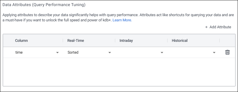 Applying attributes to your tables can significantly improve their performance. Realtime, intraday and historical attributes are a key performance tuning point for modifying the performance of queries in a kdb Insights Enterprise database. Attributes can be set differently depending on the different tiers of your database and can be tuned to optimize performance at each tier.