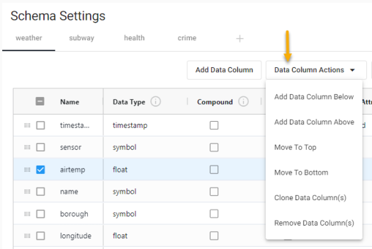 Open the column actions menu by either clicking on Data Column Actions or right-clicking on a column.