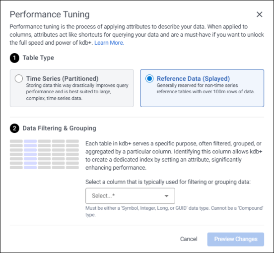 To enable performance tuning, ensure there is at least one column with a Guid, Integer, Long, or Symbol data type. If none of these data types are present, Preview Changes is disabled.