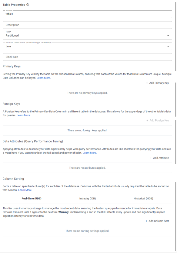 Each table in kdb+ serves a specific purpose, often filtered, grouped, or aggregated by a particular column. Identifying this key column allows kdb+ to create a dedicated index, significantly enhancing performance.