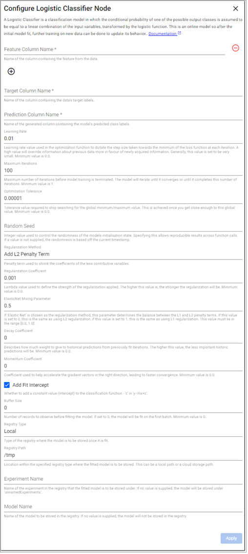 A Logistic classifier is a classification model in which the conditional probability of one of the possible output classes is assumed to be equal to a linear combination of the input variables, transformed by the logistic function. This is an online model so after the initial model fit, further training on new data can be done to update its behavior.