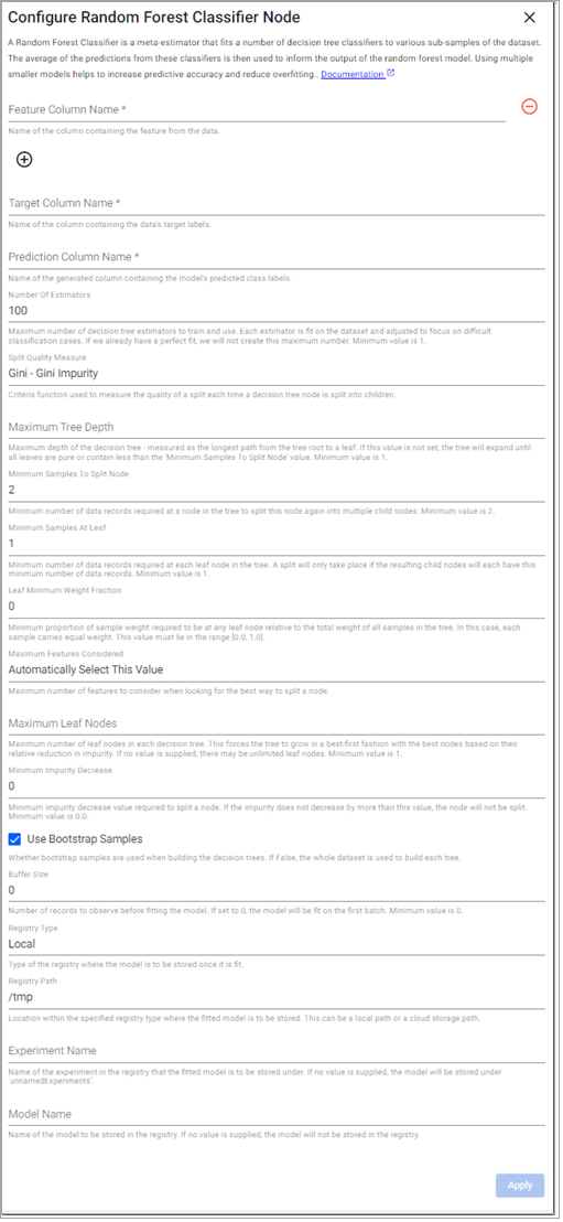 A Decision Tree Classifier predicts the value of a target by learning simple decision rules inferred from the data. These rules are used to split each node in the decision tree into child nodes to minimize impurity/entropy. It stops splitting based on the configured Maximum Tree Depth, Minimum Samples To Split, and Minimum Samples At Leaf model parameters.