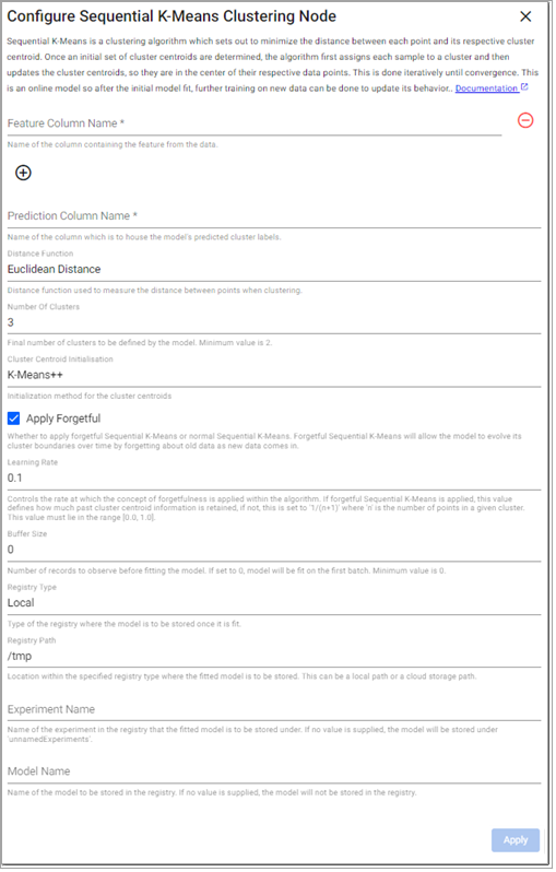 Whether to apply forgetful Sequential K-Means or normal Sequential K-Means. Forgetful Sequential K-Means allows the model to evolve its cluster boundaries over time by forgetting about old data as new data comes in. |
