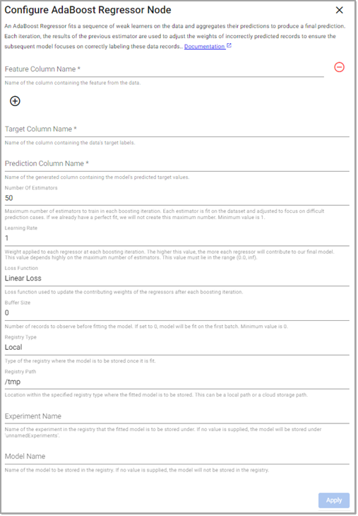 Controls the loss function used to set the weight of each regressor at each boosting iteration. The higher this value, the more each regressor contributes to our final model. This value depends highly on the maximum number of estimators. Minimum value is |