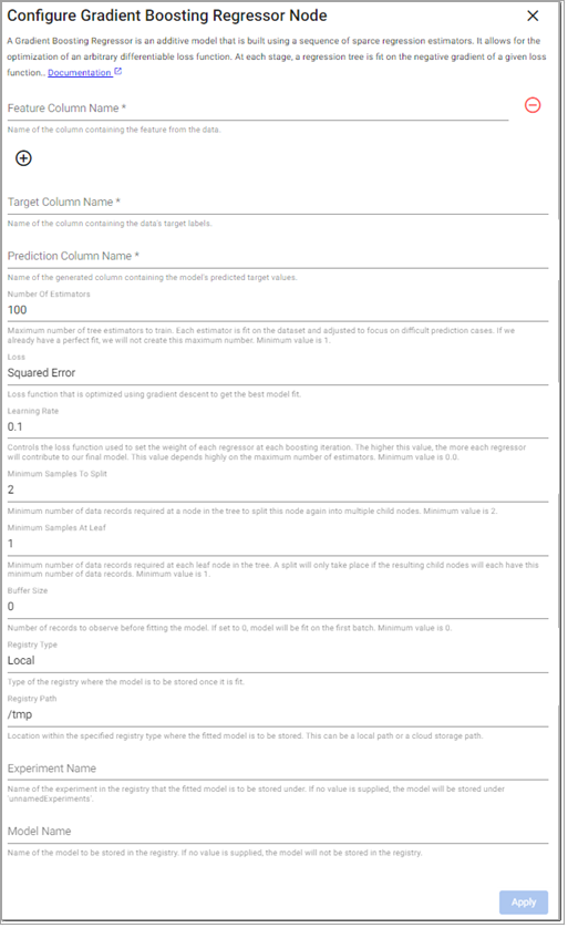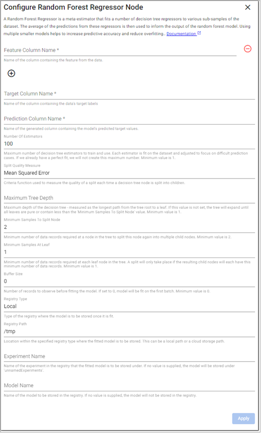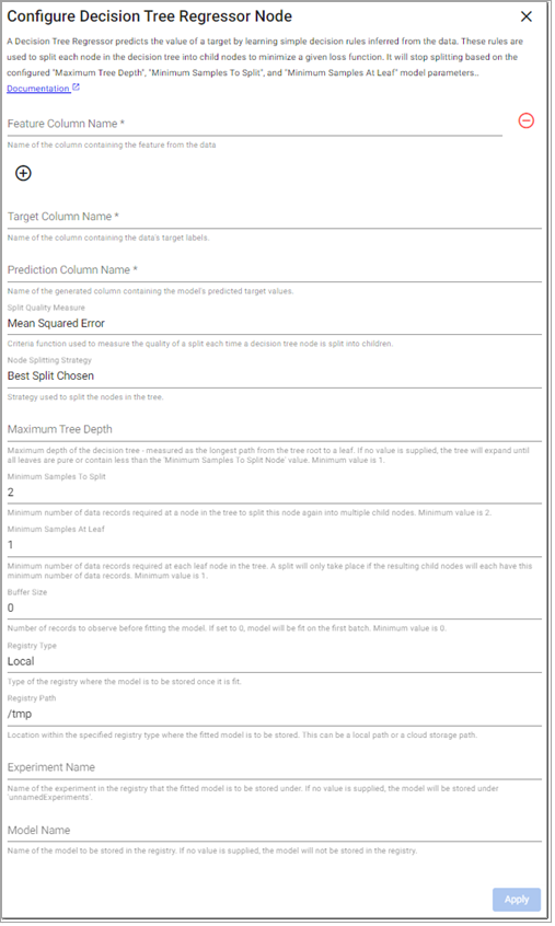 A Decision Tree regressor predicts the value of a target by learning simple decision rules inferred from the data. These rules are used to split each node in the decision tree into child nodes to minimize a given loss function. It stops splitting based on the configured Maximum Tree Depth, Minimum Samples To Split, and Minimum Samples At Leaf model parameters.