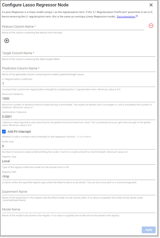 A Lasso Regressor is a linear model using L1 as the regularization term. If the L1 Regularization Coefficient parameter is set to 0, hence removing the L1 regularization term, this is the same as running a Linear Regression model.