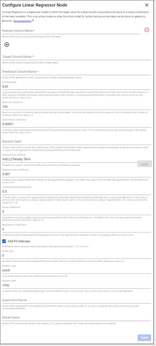 A Linear regressor is a regression model in which the target value for a data record is assumed to be equal to a linear combination of the input variables. This is an online model so after the initial model fit, further training on new data can be done to update its behavior.