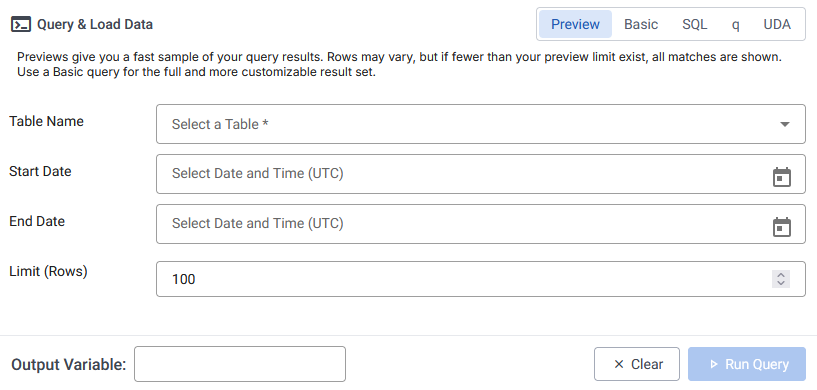 The Preview tab is a lightweight query option to fetch small samples of a table using minimal time and resources. It returns up to limit rows from the specified table and time range. It is guaranteed to search all available data for results. If fewer than limit rows are returned, they contain all the available data. Beyond this, there are no guarantees as to which particular rows are returned, and the choice is subject to arbitrary implementation details.