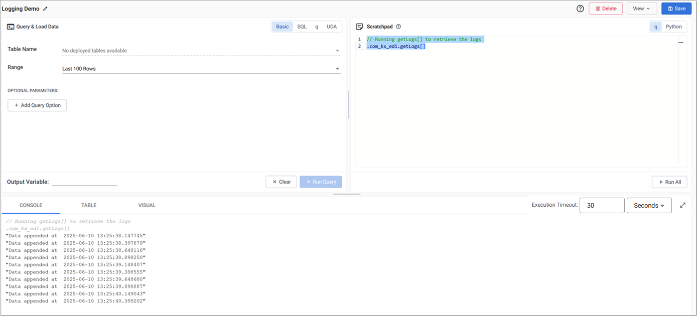 The logs written by show statements in q and print statements in Python, as well as messages written to STDERR, are written to a buffer that can be queried. This captures log messages for code run in the scratchpad editor, pipeline editors, and pipelines deployed using quick test. It does not include show statements in qsql database queries or UDAs.