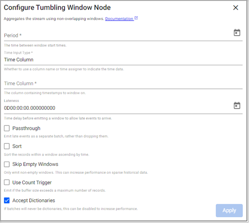 This page explains how to set up windows operators, for kdb Insights Enterprise pipelines, using the Web Interface.