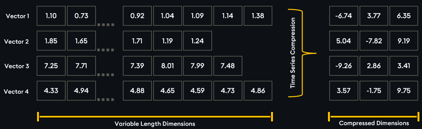 Looking for a compression model that dimensionally reduces time series windows by over 99%, while faithfully preserving the original data’s shape? Using the Transformed TSS method, KDB.AI can store and perform lightning-fast vector searches on time-series data.