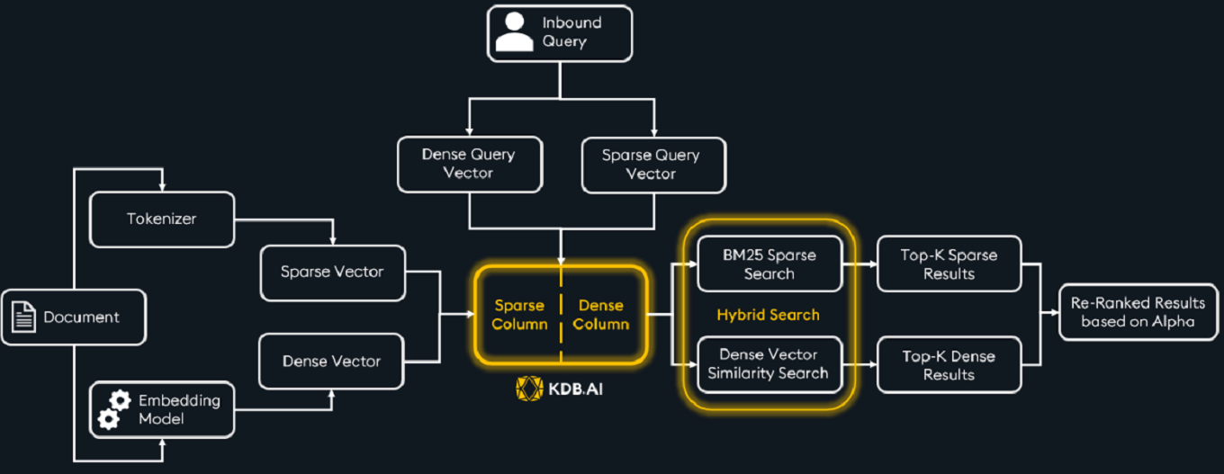 This means that with KDB.AI, you can now combine and re-rank the results based on a user-set alpha value that weighs the importance of each search type.
