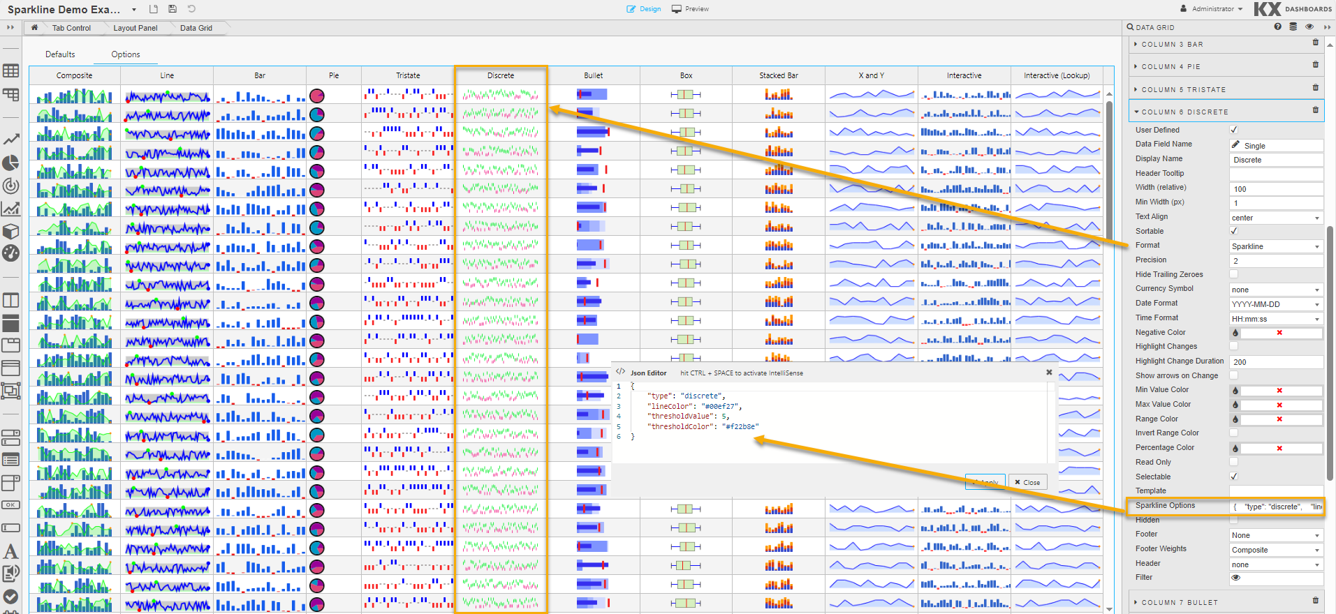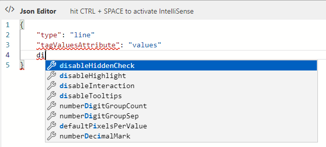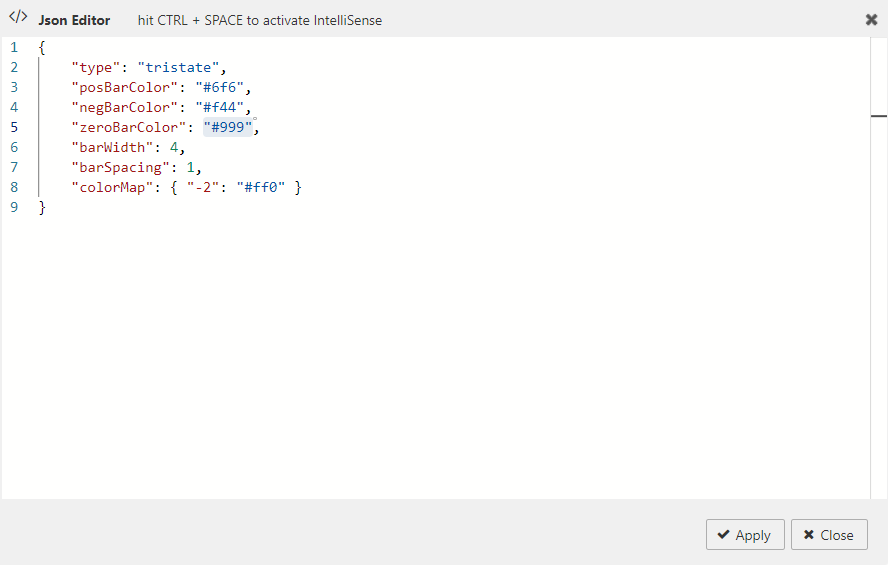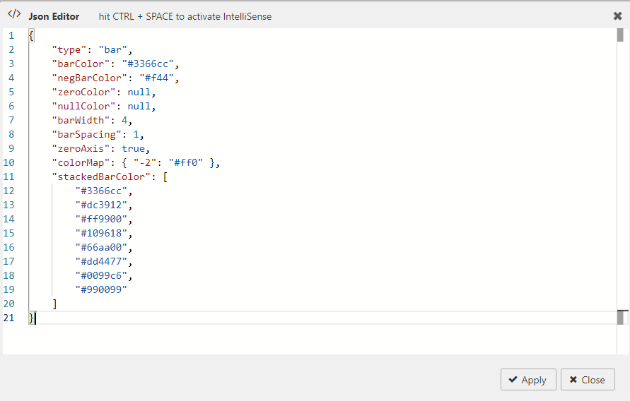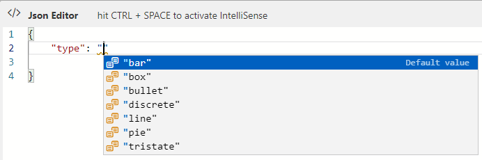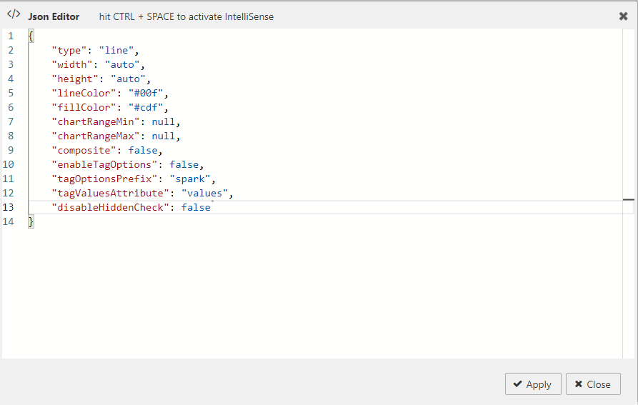 The following screenshot shows the JSON editor with these interactive sparkline specific options and their default values.