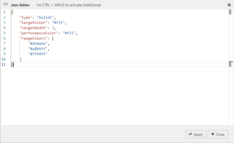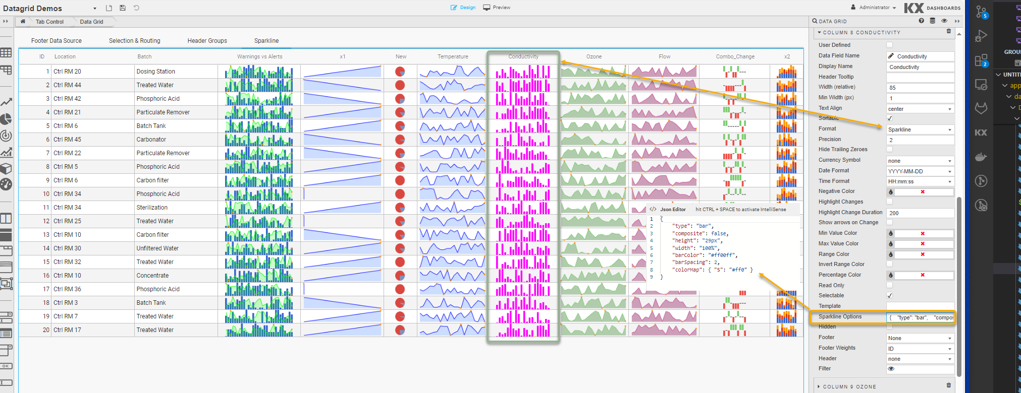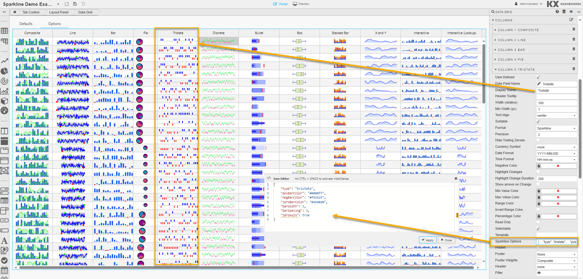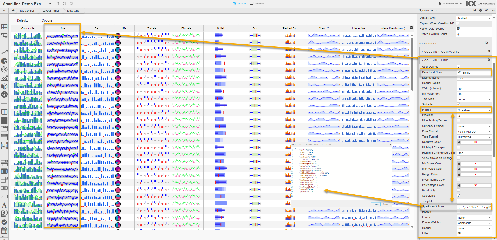 If you’re happy with the default look and feel of the tooltips, you can skip this entire section.The following options, used to control sparkline interactions, can be specified in the JSON editor for Sparkline Option when the Format is set to Sparkline in Column properties: