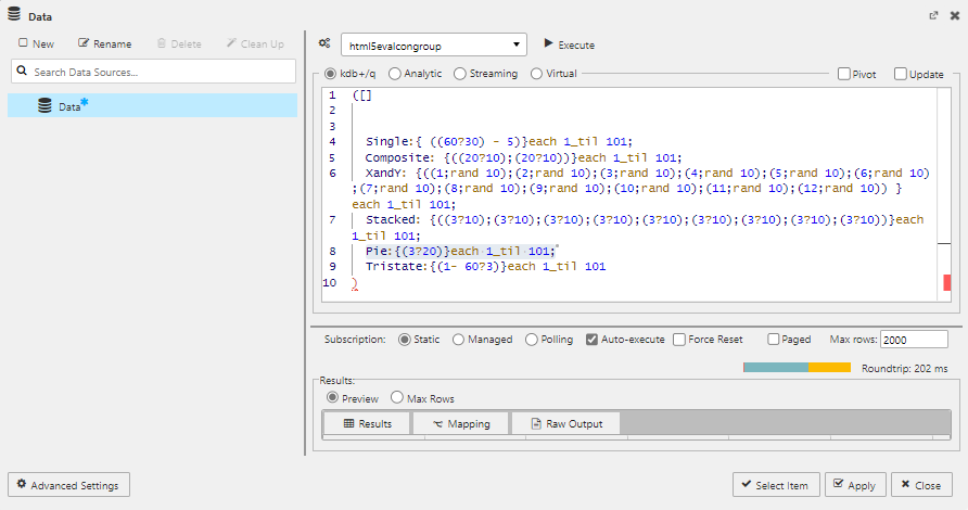 Define the query or analytic to be used to retrieve data. See Data Sources for further details. |