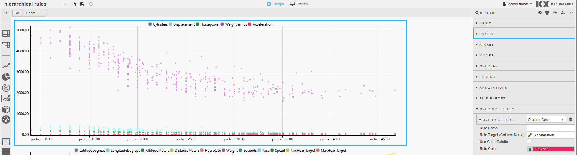 In this example, the top ChartGL component is configured to override the Custom Color hierarchical rules using the following Override Rule settings: