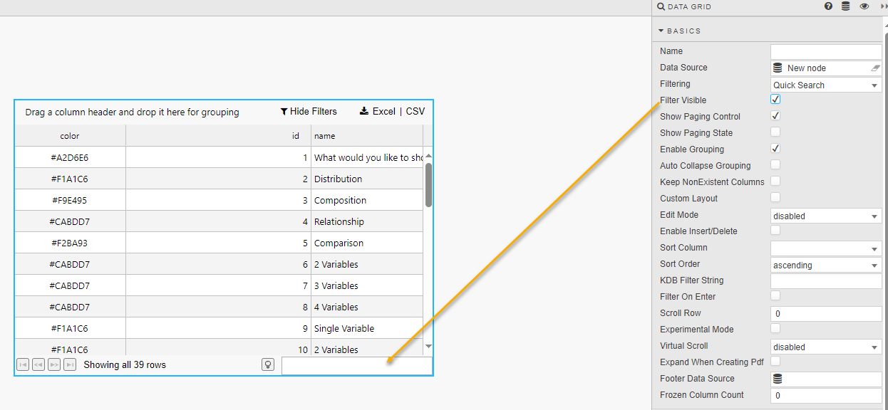 To set up a Data Grid component, click and drag the component into the workspace and configure the following: