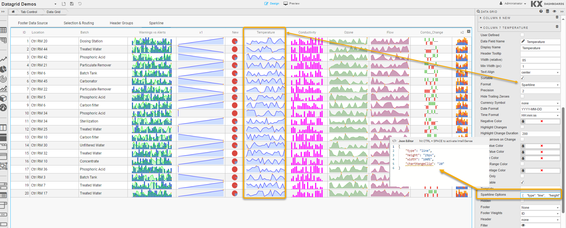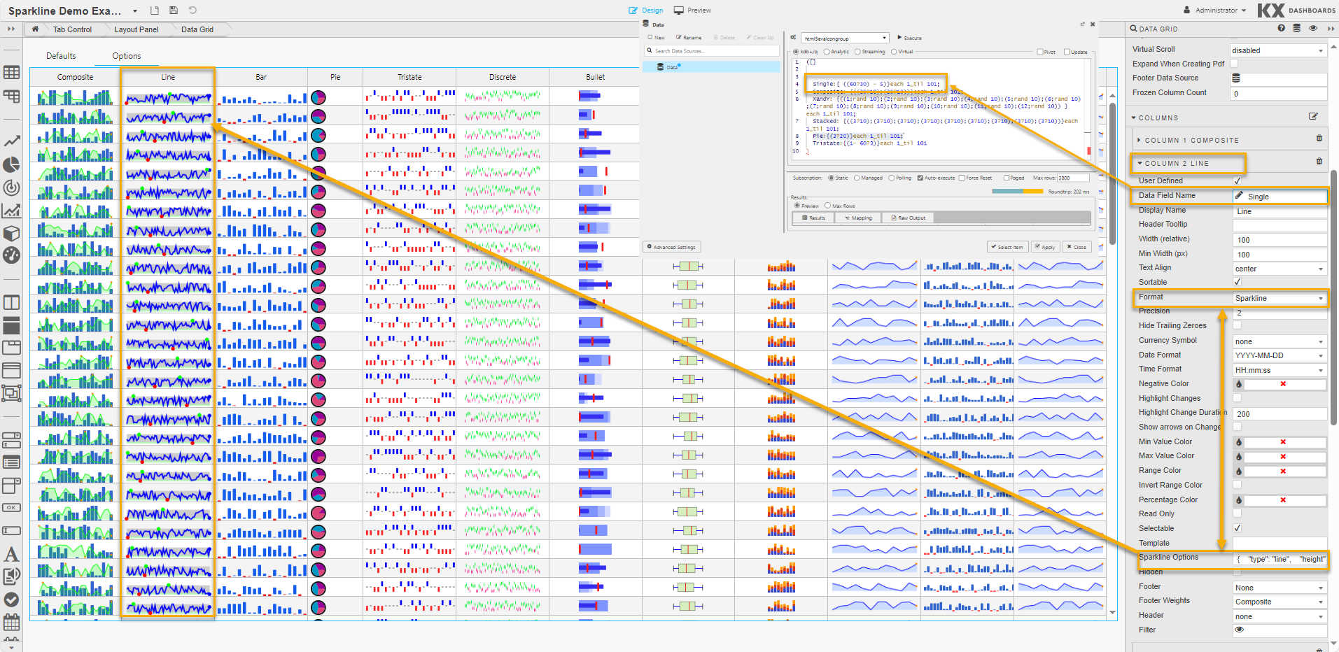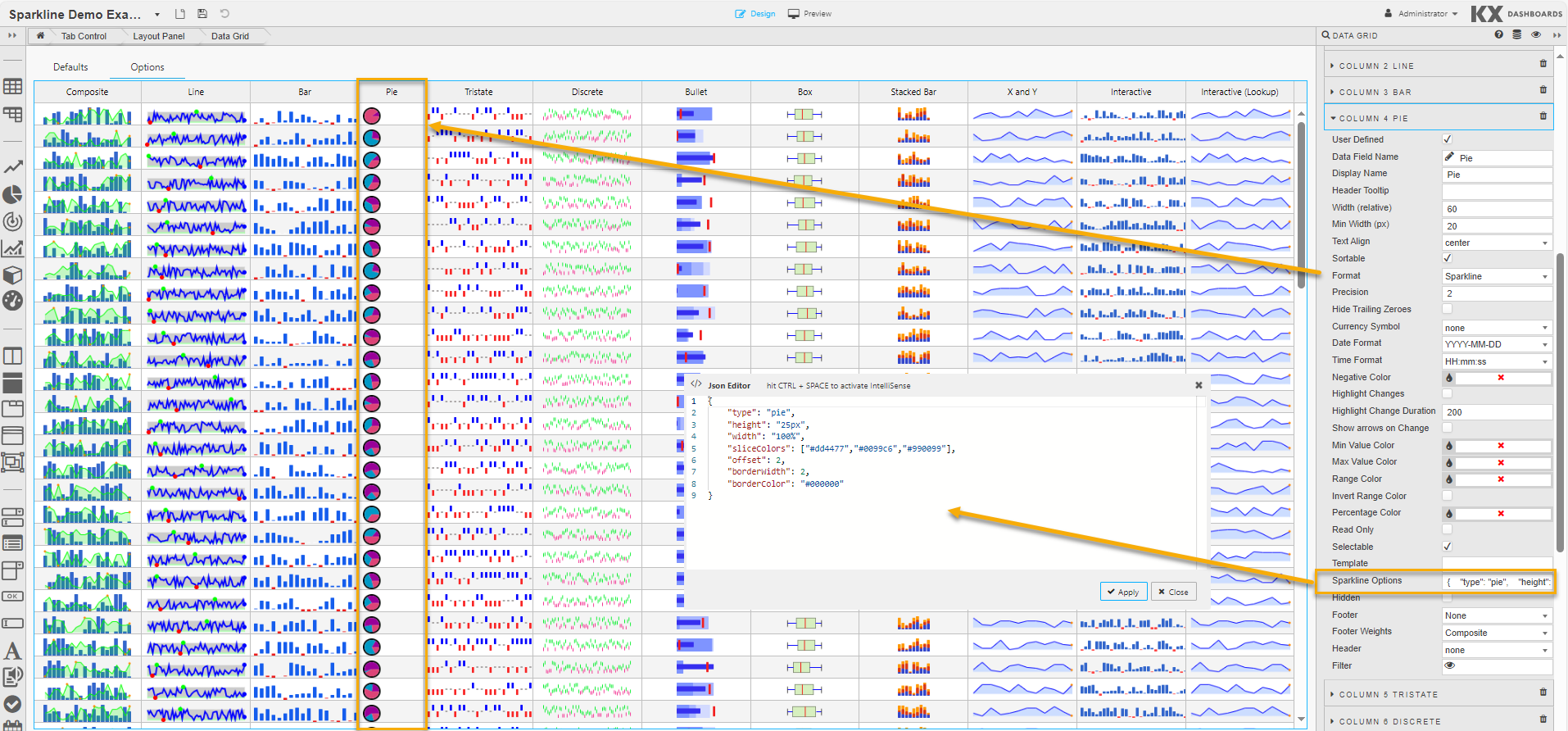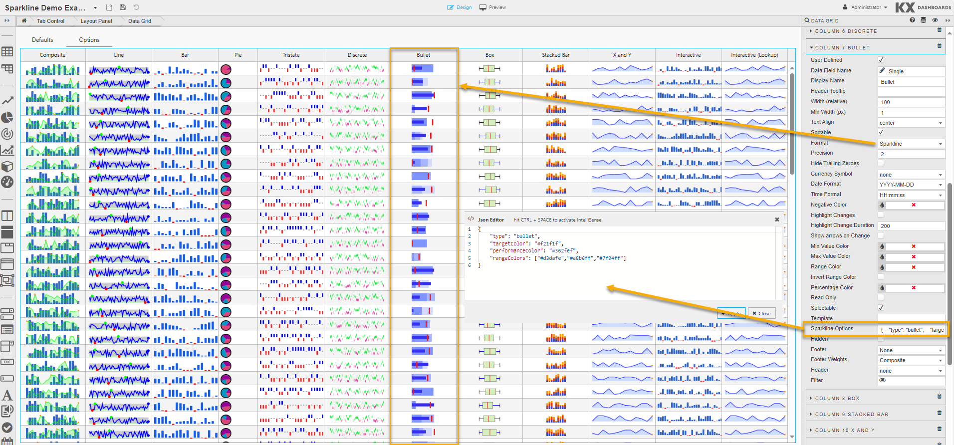 If you’re happy with the default look and feel of the tooltips, you can skip this entire section.The following options, used to control sparkline interactions, can be specified in the JSON editor for Sparkline Option when the Format is set to Sparkline in Column properties: