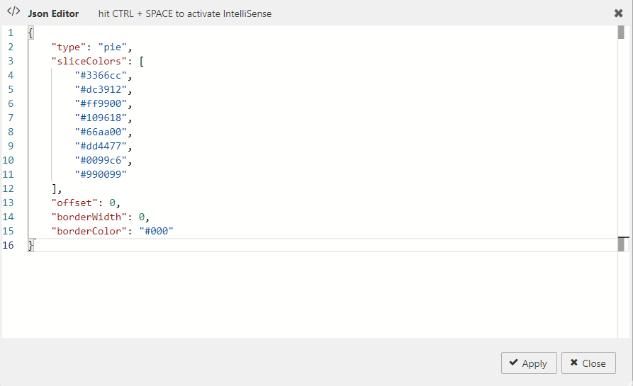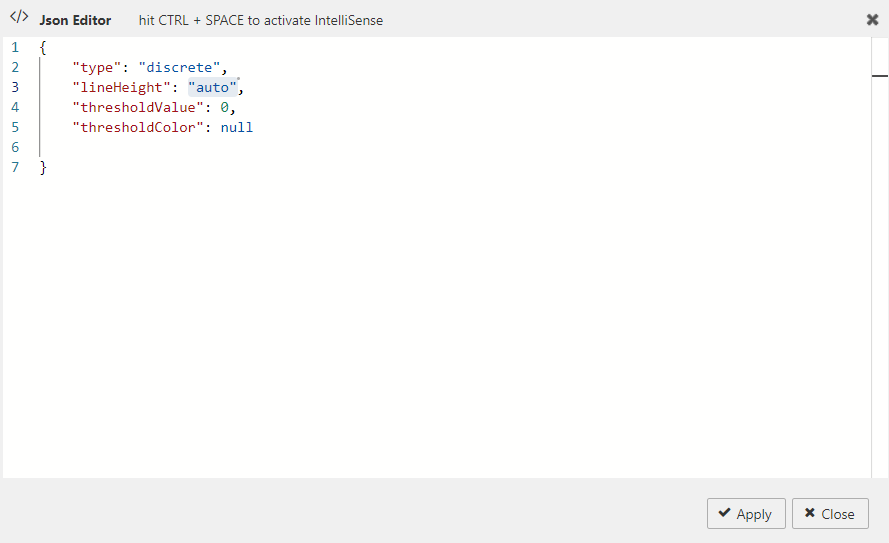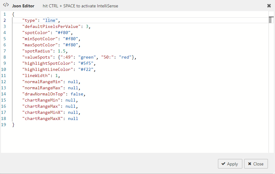 The following screenshot shows the JSON editor with these interactive sparkline specific options and their default values.