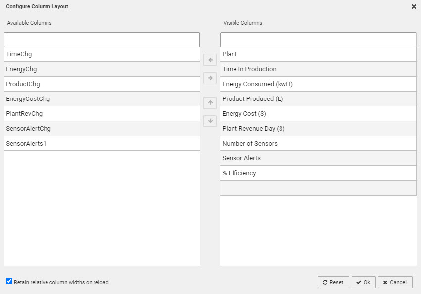 Hidden columns are visible in the Available Columns list. This may not be desirable if a hidden column stores a calculation or highlight rule operator. In such instances it may be necessary to disable Custom Layout User configuration is saved on exiting the dashboard and is available on next login.